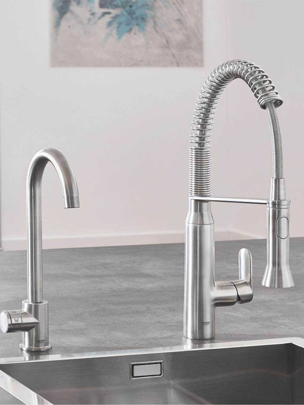 Die GROHE Blue Home Sprudelarmatur ist in unterschiedlichen Oberflächen und Auslaufformen erhältlich, sowie optional mit herausziehbarem Mousseur und mit Steuerung per GROHE Wassersystems App.