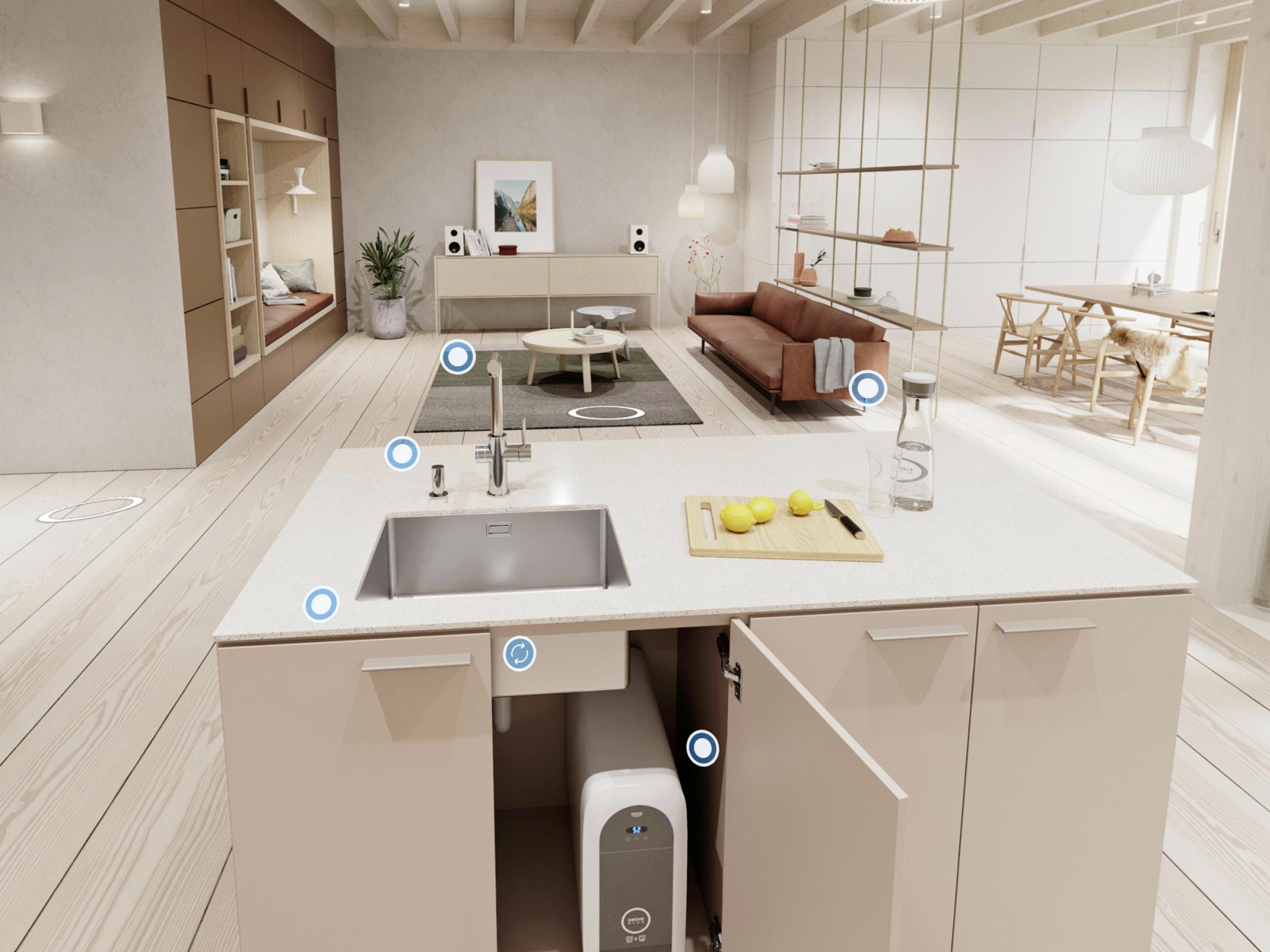 Laden Sie die GROHE Watersystems AR App (verfügbar für Android und iOS) herunter, um ein GROHE Wassersystem in Augmented Reality bei Ihnen zu Hause auszuprobieren. Mit dieser App können Sie ein GROHE Wassersystem und eine GROHE Küchenspüle virtuell in Ihrer eigenen Küche installieren, bevor Sie sich für den Kauf entscheiden. -