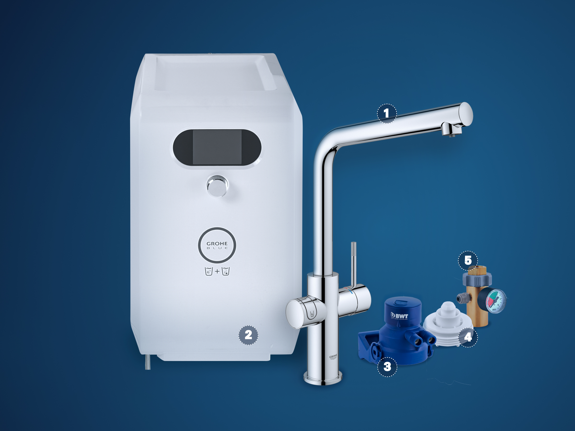 Das GROHE Blue Professional Set enthält einen GROHE Blue Professional Spültisch-Einhandmischer mit Filterfunktion, einen GROHE Blue Professional Kühler mit Bluetooth- und WLAN-Schnittstelle, einen Filterkopf mit flexibler Wasserhärteeinstellung, einen Reinigungskartuschen-Adapter, eine Druckanzeige für 2-kg-Flaschen sowie Installationsmaterial.