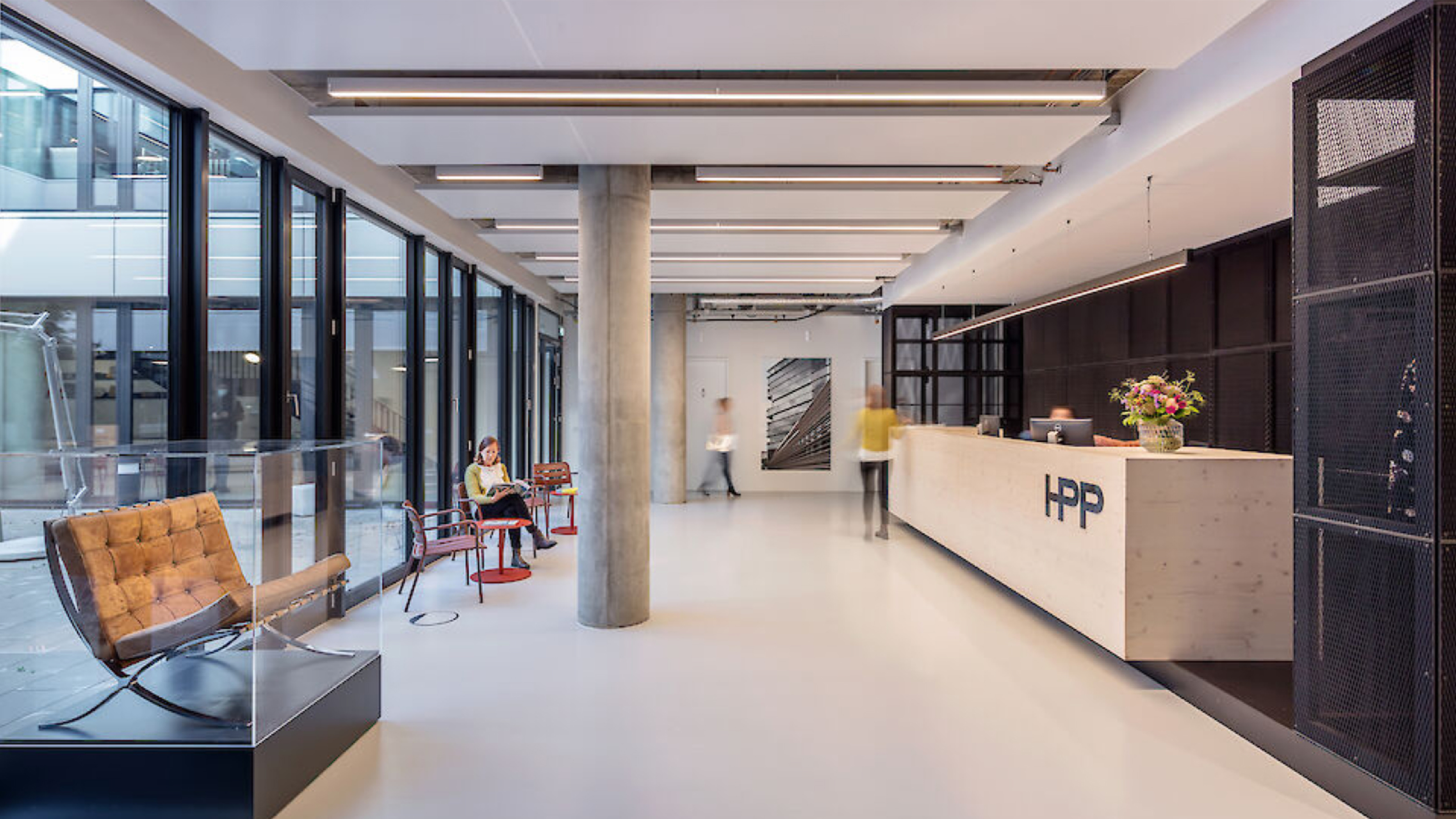 Moderne Büroflächen, Erlebnisgastronomie und möblierte Design-Wohnungen für komfortables Wohnen: Das H27 im Düsseldorfer Medienhafen verbindet diese Nutzungskonzepte auf elegante Weise. Der Neubau des Projektentwicklers INTERBODEN wurde nach Plänen von HPP Architekten errichtet und ist seit Anfang 2020 auch der Hauptsitz des international renommierten Büros. Auf drei Etagen finden die 170 Mitarbeiter zahlreiche inspirierende Räume für kreatives Arbeiten.